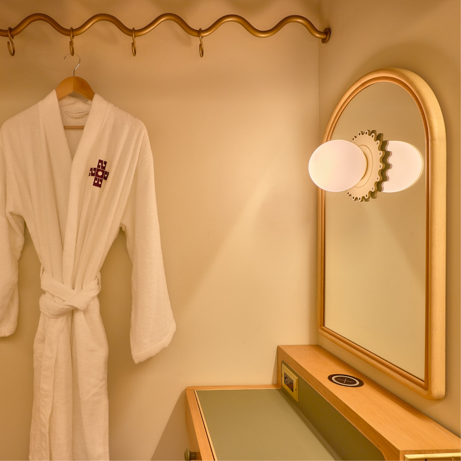 Rooms are kitted with luxury linens, towels, robes, hooks, hangers, a safe, two outlets, and a wireless charging dock, plus earplugs and an eye mask to help you recharge.